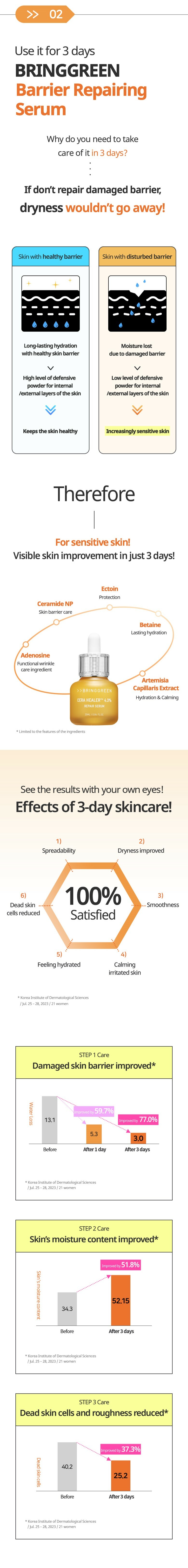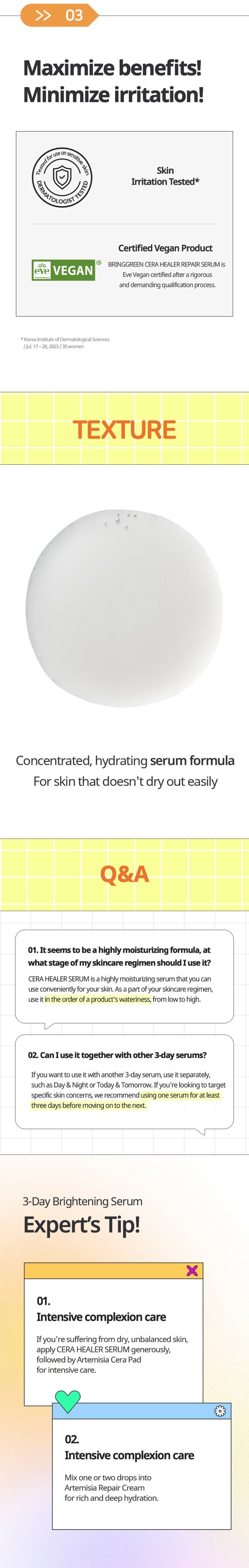 - Intensive care: Apply a thick layer of the serum and use BRING GREEN Artemisia Cera Calming Moisture Toner Pad for intensive care